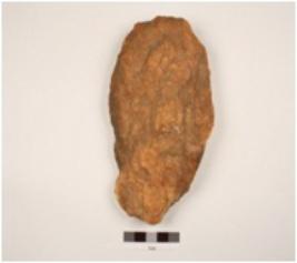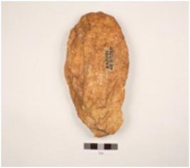 | Description / विवरण | A handaxe made on quartzite flake, flake scars on one side, use-wear marks on cutting edges, partly broken from one end, biconvex in section. |