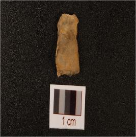 | Description / विवरण | A small parallel sided flake, made on quartz, prepared platform is visible, use wear marks on edges. |