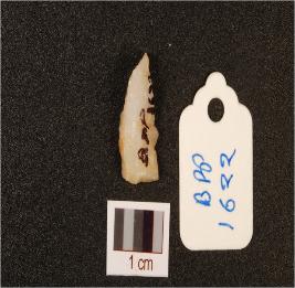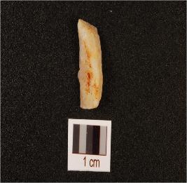 | Description / विवरण | A small knife shaped flake, made on quartz, ridge on dorsal, cutting marks on edges. |