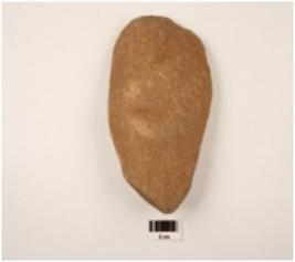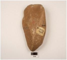 | Description / विवरण | A cleaver made on the quartzite pebble, broad cutting edge on the anterior, thick butt end on posterior, prepared platform, large flakek scars, oval in section. |