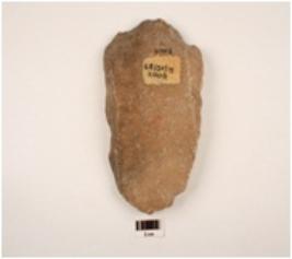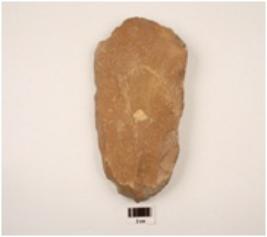 | Description / विवरण | A cleaver made on quartzite side struck flake, prepared platform, diffused bulb on ventral side, wavy and broad cutting edge, flake scars on the dorsal side, trapezodial in section. |