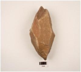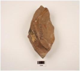 | Description / विवरण | A bifacial chopping tool made on quartzite pebble, flake scars on both side, wavy cutting edge on anterior flat butt end posterior, cortex visible at the butt end, lentieular in section. |