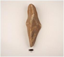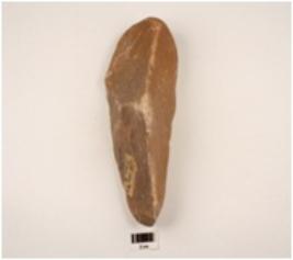 | Description / विवरण | A handaxe made on the quartzite flake with cortex on the butt end, deep flake scars on both side, tapering on working edge, round on the other edge, triangular in section. |