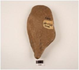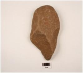 | Description / विवरण | A bifacial chopping tool made on quartzite pebble, flake scars on one side, tapering cutting edge on the anterior, round at the posterior, oval in section. |