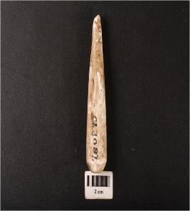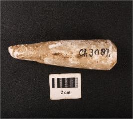 | Description / विवरण | A modified shell stylus, polished surface with deep cracks. |