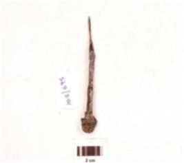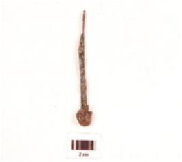 | Description / विवरण | An iron nail, uneven surface, pointed tip, broken head and rusted. |
