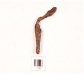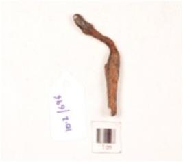 | Description / विवरण | A slanted iron nail, uneven surface, flat from bottom, rectangular in section and rusted. |