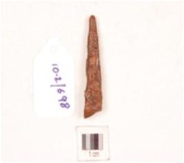 | Description / विवरण | A fragment of iron nail, uneven in surface, rusted, pointed end. |