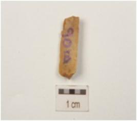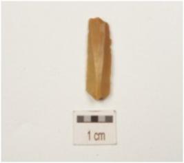 | Description / विवरण | Fragment of a blade, made on chert, ridge on dorsal side, detached from a prepared platform, broken along distal end, use-wear marks along the cutting edge and bulb absent on ventral side. |