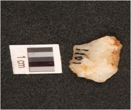 | Description / विवरण | A quartz flake with use wear marks on cutting edges, working edges slightly broken, flake scars on dorsal surface, diffused bulb on ventral surface. |