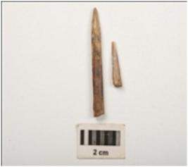 | Description / विवरण | A Broken bone awl with polished surface, circular cross section, pointed at one end. B Fragment of bone awl with polished surface, circular cross section, pointed at one end. |