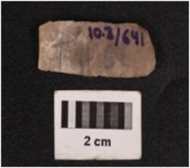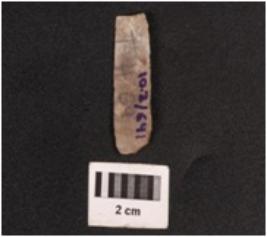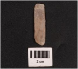 | Description / विवरण | A parallel sided blade made on chert with a ridge on the dorsal surface, positive bulb on the ventral side, use-ware marks on the cutting edges, triangular in section. |