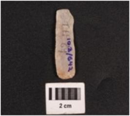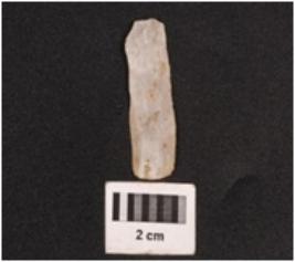 | Description / विवरण | A parallel sided microlithic blade wih a ridge on the dorsal surface, use-ware marks on the cutting edges, broken at distal end, triangular in section. |
