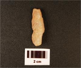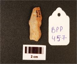 | Description / विवरण | Quartz side scraper, prepared platform, diffused bulb at distal end, visible cortex, uneven surface. |