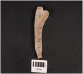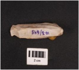 | Description / विवरण | Fragment of a blade core made on chert with four flake scars on the surface, cortex at the edge, trapezoidal in section. |