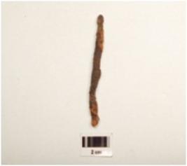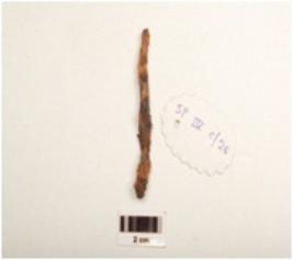 | Description / विवरण | Iron nail with rough surface, uneven, partly broken from both ends, rusted and square in section. |
