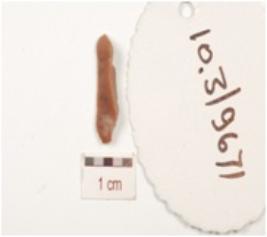 | Description / विवरण | A blade made on chert, prepared striking platform on proximal end, diffused bulb on ventral surface, use wear marks on cutting edge, partly ridge on surface and triangular cross section. |