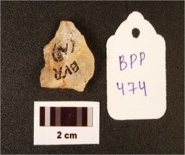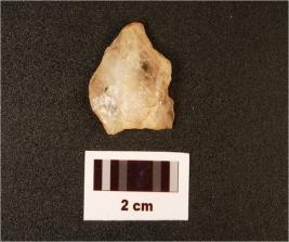 | Description / विवरण | A quartz side scraper, prominent bulb at distal end, prepared platform. |