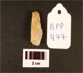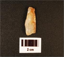 | Description / विवरण | A side scraper, visible used wear marks, prepared platform, triangular cross section, parallel flake scars on surface. |