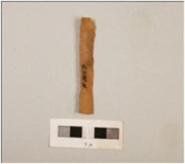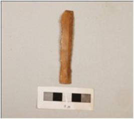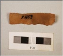 | Description / विवरण | A chert blade with a mid-ridge on dorsal side, triangular in section, prepared platform and distal end broken. |