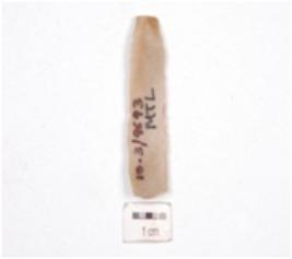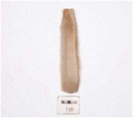 | Description / विवरण | A chert blade with double ridge on dorsal, prepared platform, diffused bulb on ventral, use wear marks on cutting edge, trapezoidal cross section and broken along distal end. |