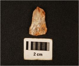 | Description / विवरण | Quartz, flake, irregular shape, use wear mark along one cutting edges. |