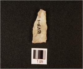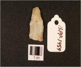 | Description / विवरण | Quartz, flake, tappering shape, one balde scars, mark on the cutting edges. |