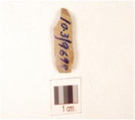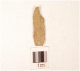 | Description / विवरण | A chert blade with prepared platform, trapezoidal cross section, prominent bulb on ventral side and use-wear marks along the cutting edge. |