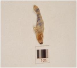 | Description / विवरण | Chalcedony blade with wavy mid ridge, prominent bulb on ventral side, triangular cross section and use-wear marks along the cutting edge. |