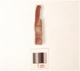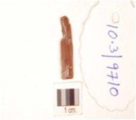 | Description / विवरण | Chert blade with triangular cross section, prepared platform, prominent bulb on ventral side and use wear marks on cutting edge. |