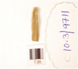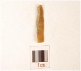 | Description / विवरण | Chert blade with prepared platform, trapezoidal cross section, prominent bulb on ventral side and use-wear marks along the cutting edge. |