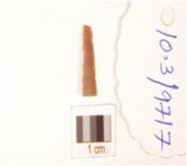 | Description / विवरण | Chert blade with prepared platform, trapezoidal cross section, use-wear marks along the cutting edge and bulb absent. |