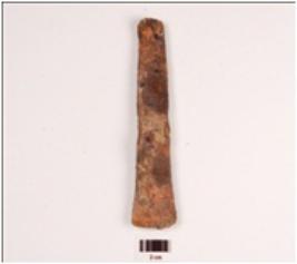 | Description / विवरण | An iron chisel, one end is flat and sharp cracks on surface, rectangular in shape, surface is rusted. |