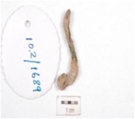 | Description / विवरण | Fragment of a copper fish hook with green-incrustation on surface. |