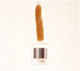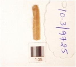 | Description / विवरण | Chert blade with triangular cross section, prominent bulb on ventral side and use-wear marks along the cutting edge. |