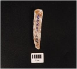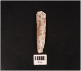 | Description / विवरण | A chert blade with single mid-ridge on dorsal side, triangular in section, prepared platform, distal end broken, and use-wear marks along the cutting edges. |