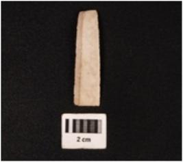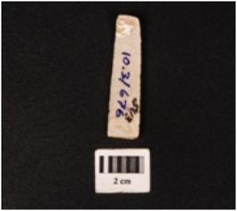| Description / विवरण | A chert blade with a prominent ridge on dorsal side, prepared platform, distal end broken and use-wear marks along the cutting edges. |