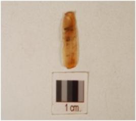 | Description / विवरण | Chalcedony blade with triangular cross section, prepared platform, use wear marks along the cutting edge and bulb on ventral side. |