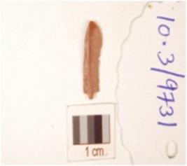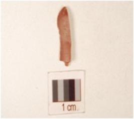 | Description / विवरण | Chert blade with triangular cross section, prepared platform, prominent bulb on ventral side and use-wear marks along the cutting edge. |