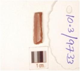 | Description / विवरण | Chert blade with prepared platform, triangular cross section, use-wear marks along the cutting edge and bulb absent. |