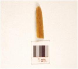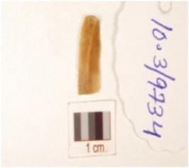 | Description / विवरण | Chert blade with triangular cross section, prominent bulb on ventral side and prepared platform. |