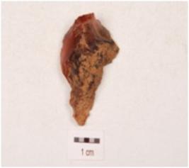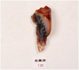 | Description / विवरण | A small triangular shaped unifacial point, made on chalcedony with irregular retouch along the edge, traces of cortex on one face. |