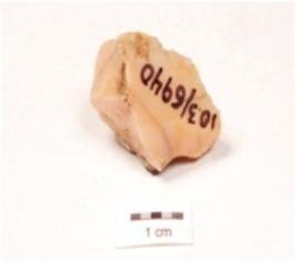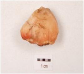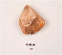 | Description / विवरण | A small triangular shaped chalcedony core with flake scars around the surface, cortex on the exterior. |