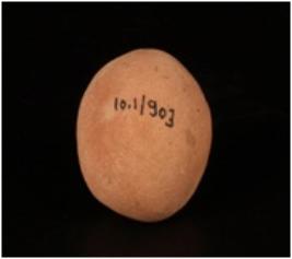 | Description / विवरण | Handmade terracotta sling ball, made with well levigated clay, well baked, uneven round shape, surface treated with a wash in buff colour. |