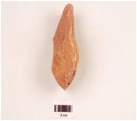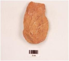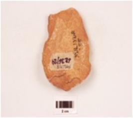 | Description / विवरण | A handaxe made on quartzite end struck flake, biconvex in cross section, flake scars on both sides, and broken from pointed end. |