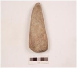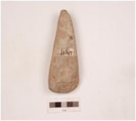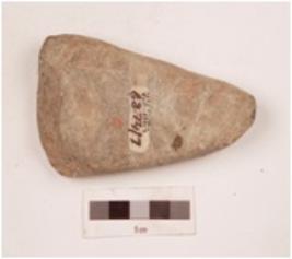 | Description / विवरण | A sandstone axe, triangular in shape, rectangular in cross section, pointed butt end and partly broken from the working edge. |