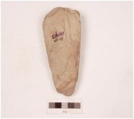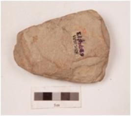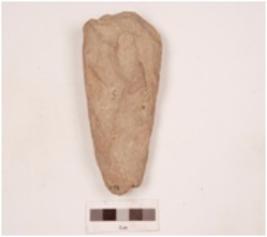 | Description / विवरण | An unfinished sandstone axe, triangular in shape, biconvex in cross section and flake scars on both sides. |