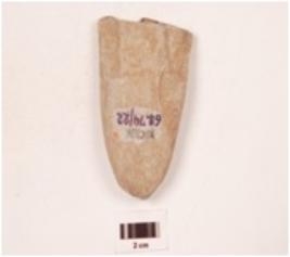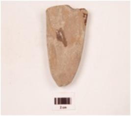 | Description / विवरण | A sandstone celt with oval cross section, broken from one side and flake scars on both sides. |