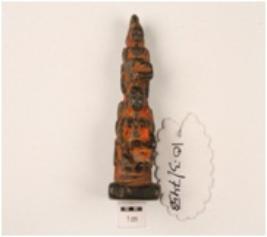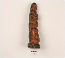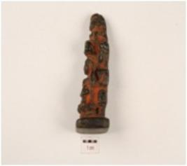 | Description / विवरण | Seated deity on pedestral, two human figurines are standing back and one sitting on hir head, black in colour. |