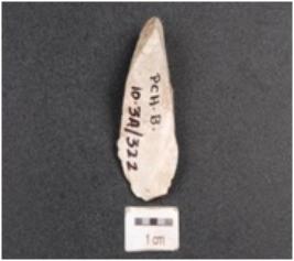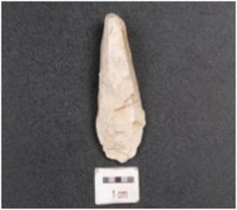 | Description / विवरण | A utilized flake has blade scars on surface , use wear marks on one edge and broken tip. |